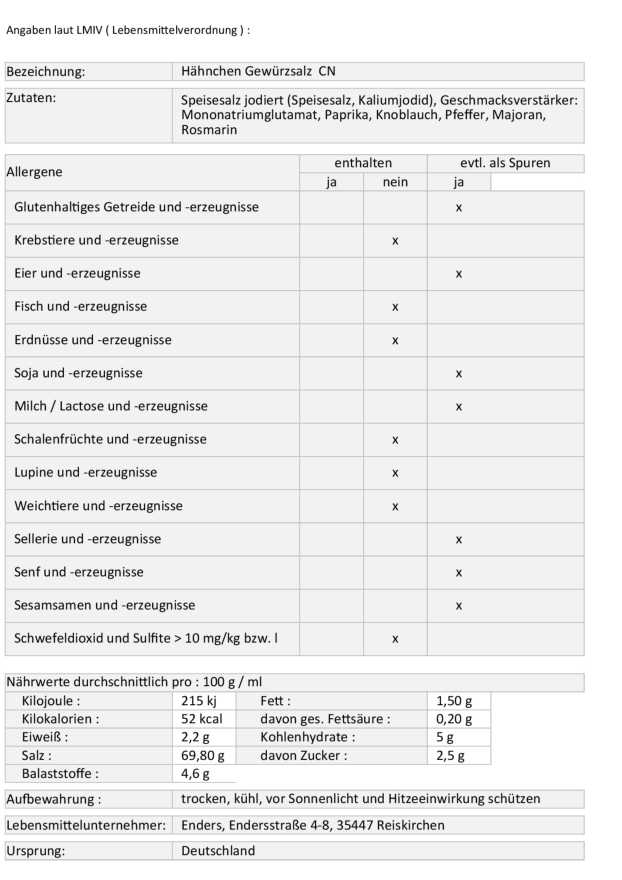 Zutaten: Speisesalz jodiert (Speisesalz, Kaliumjodid), Geschmacksverstärker: Mononatriumglutamat, Paprika, Knoblauch, Pfeffer, Majoran, Rosmarin